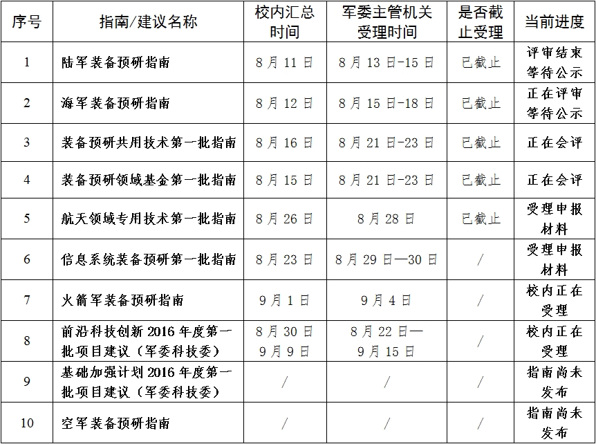经过周密细致的安排部署,暑假期间,科研院组织相关单位高效、紧张、有序的完成了“十三五”装备预研首批指南申报和国防科技发展项目建议的阶段性任务。现将申报、建议工作的重要时间节点和注意事项公告如下: