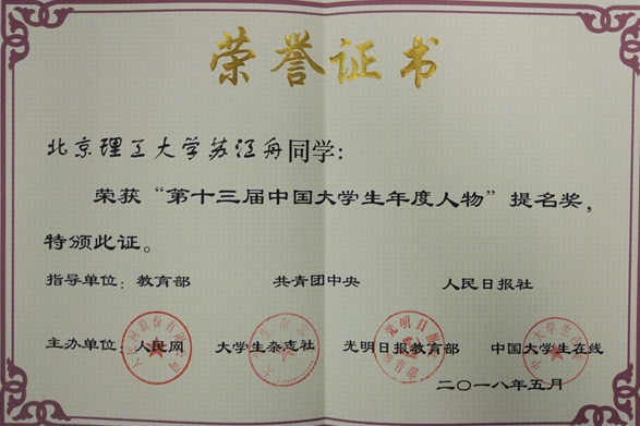 北理工学子获“第十三届中国大学生年度人物”提名奖