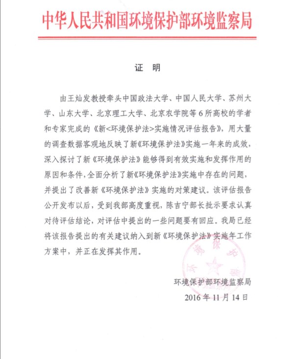 北理工教师参与完成《新<环境保护法>实施情况评估报告》获国家环保部长批...