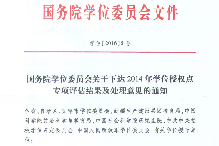 近日,国务院学位委员会印发了《国务院学位委员会关于下达2014年学位授权点专项评估结果及处理意见的通知》(学位〔2016〕5号),公布...