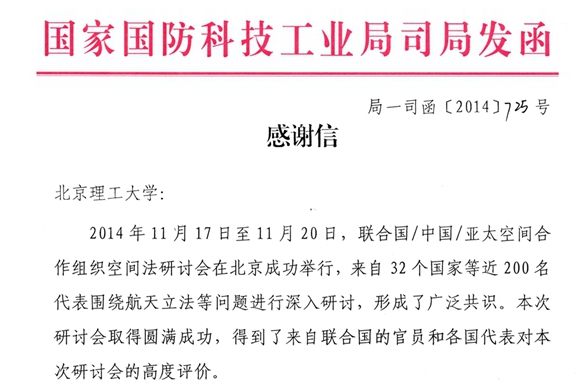 国防科工局致信感谢北理工为国际空间法研讨会提供支持