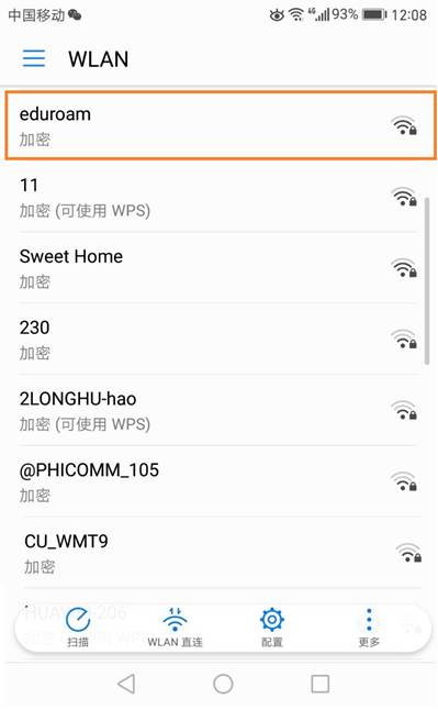 1、使用无线终端搜索到无线网名称eduroam,点击连接该网络,如图1所示;