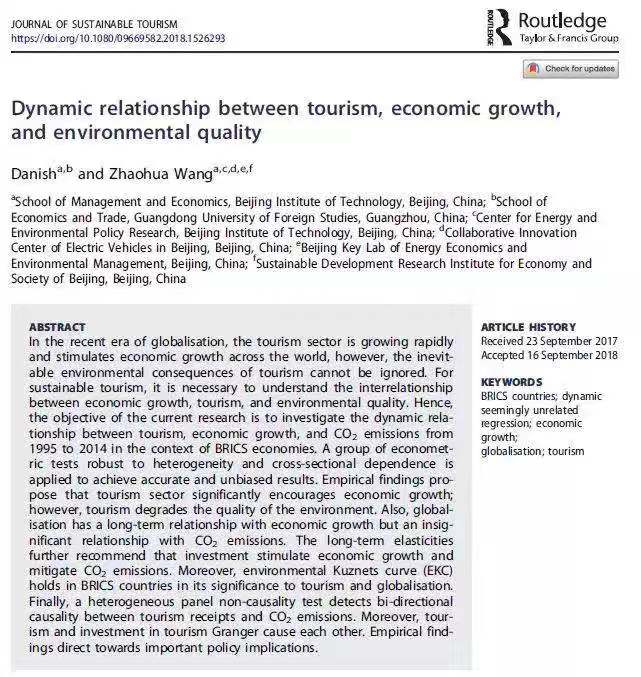北理工管理与经济学院王兆华教授领衔的团队研究成果“旅游、经济与环境质量的动态关系”(Dynamic Relationship Between Tourism, Economic Growth, and Environmental Quality),发表于国际旅游研究顶级期刊《Journal Of Sustainable Tourism》。该刊是国际旅游研究中公认的四大权威期刊之一,根据Web of Science期刊排名,该期刊在SSCI期刊“绿色&可持续科学&技术”类别中排名第一,属SSCI一区期刊。文章第一作者Danish博士为我院研究生,王兆华教授是该文通讯作者。
