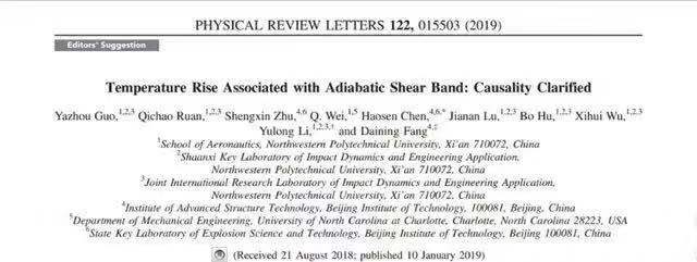 日前,物理学顶级期刊《物理评论快报》(Physical Review Letters)在线报道了西北工业大学、九游会在线注册,(中国)科技公司(共同完成单位)联合研究成果。在方岱宁院士、李玉龙教授的指导下,郭亚洲副教授(第一作者)、陈浩森副教授(共同通讯作者)、朱盛鑫博士和阮启超硕士等开展了绝热剪切带的产生和温度之间的因果关系研究 (Temperature Rise Associated with Adiabatic Shear Band: Causality Clarified),这篇文章主编被选为“Editor’s Suggestion” 。