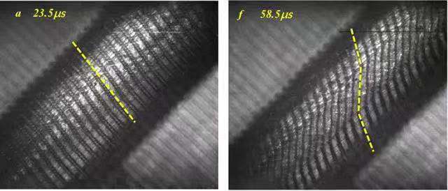 图3给出三个阶段的变形特征。栅线的不连续表明了剪切变形局部化过程。同时可以看出,在试样达到最大应力时,试样表面的栅线没有出现不连续状态,意味着没有绝热剪切带的出现。而传统观点认为当应力达到最大值时,试样内出现绝热剪切带。实验结果与现有假设矛盾。