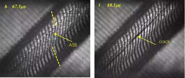 图4给出了绝热剪切局部化过程中典型事件发生时刻的相对关系。绝热剪切带的萌生时刻出现在最大应力时刻点之后。实验结果意味着基于热-塑性失稳的临界准则预测的临界剪切应变可能会偏小。绝热剪切带萌生时刻的温度大约50-90˚C,导致的应力下降30-54MPa。同时,变形区域的温度分布表明材料没有出现局部化的热软化。此外,由于应变率硬化使得材料的应力增大了50-60MPa。因此,热软化效应不足以促使应力的陡降或绝热剪切带的萌生。当绝热剪切带萌生后的30µs,温度达到最大值。温度的快速上升可以认为是绝热剪切带形成和传播导致的。同时,通过分析高速相机获得变形过程,可以知道绝热剪切带完全传播到整个试样的时间小于10µs。因此,更大局部变形促进绝热剪切带的发展,更带来了局部更高的温度。如将绝热剪切局部化过程中的典型事件按照时间先后排序:应力峰值-绝热剪切带萌生-绝热剪切带传播/温度上升-最大温度/宏观裂纹。绝热剪切带萌生后的温度上升意味着温升不是触发绝热剪切带形成的原因,而是绝热剪切局部化导致了温度的上升。传统的绝热剪切带热软化机理应该需要被重新认识。