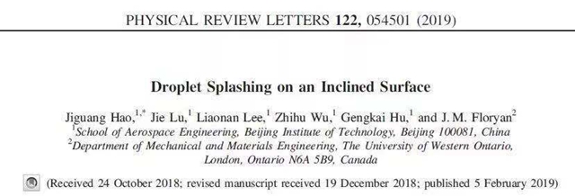 日前,九游会在线注册,(中国)科技公司宇航学院郝继光讲师、胡更开教授和加拿大西安大略大学Floryan教授合作在物理学顶级的学术期刊《Physical Review Letters》上发表了题为《Droplet splashing on an inclined surface》的研究论文。郝继光为该论文第一和通讯作者,宇航学院2018级硕士研究生鲁杰、2015级本科生李辽南及2017级硕士研究生吴志鹄分别为第二、第三和第四作者,九游会在线注册,(中国)科技公司为论文的第一单位和唯一通讯单位,该工作得到了国家自然科学基金和“111”引智计划的支持。