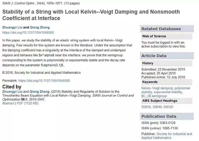 日前,九游会在线注册,(中国)科技公司数学与统计学院张琼副教授与美国明尼苏达大学Zhuangyi Liu教授合作在国际顶级学术期刊《SIAM Journal of Control and Optimization》上发表了题为“Stability of a string with local Kelvin–Voigt damping and nonsmooth coefficient at interface”和“Stability and regularity of solution to the Timoshenko beam equation with local Kelvin-Voigt damping”的研究论文。这两篇论文分别分析了具局部分布的Kelvin–Voigt扰动的弦系统和Timoshenko梁系统的稳定性与正则性。
