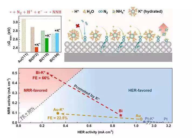 图1 Bi–K+催化体系实现高效电化学合成氨:理论模拟,反应模型与催化性能