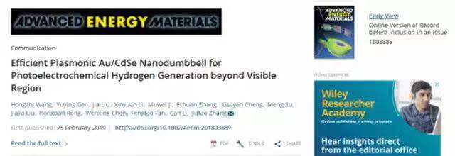 团队与中科院大连化物所李灿院士团队合作,在金属@半导体异质纳米结构研究积累基础上(Science, 2010; Adv. Mater., 2014; Angew. Chem. Int. Ed., 2015; Adv. Mater., 2016; Nano Energy, 2018; Nano Energy, 2019; J. Mater. Chem. Mater. A, 2018)通过精确调控Au/Ag核壳纳米晶的硒化反应以及逆向竞争的水相阳离子交换反应,实现了从核壳结构(core/shell)到哑铃结构(nanodumbbell)演变的Au/CdSe异质纳米棒的制备及异质界面的高质量构建。得益于Au棒的纵向SPR效应及两端的电磁场增强“热点”以及高质量的异质界面,制备的Au/CdSe HNRs在近红外区具有很强的光吸收特性,实现了Plasmon增强的高效热电子注入效应。结合空间分辨的表面光电压成像表征(与李灿院士团队合作),成功研发出一种在近红外光波段具有高的吸收效率,又具有高的可见-近红外光电催化产氢性能,且其法拉第效率高达96%的光电催化材料。光电催化产氢活性(45.29 μmol cm-2 h-1)通过5天的连续测试,没有明显降低。北理工的王虹智博士研究生以及大连化物所的高玉英博士研究生为共同第一作者。相关工作以“Efficient plasmonic Au/CdSe Nano-dumbbell for Photoelectrochemical Hydrogen Generation beyond Visible Region”为题,在线发表在《Advanced Energy Materials》 (2019, DOI: 10.1002/aenm.201803889)上。