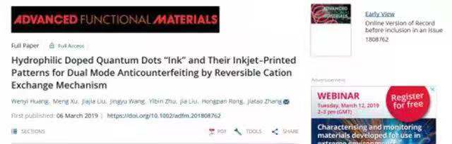 团队基于已有的半导体掺杂纳米晶/量子点研发基础(Angew. Chem. 2015; Adv. Mater. 2015; Nature Nanotech. 2018; Angew Chem. 2018),发现了Ag掺杂CdX(X="S," Se等)等II-VI族量子点的可逆阳离子交换(Ag2X与CdX之间的可逆转化)可多次实现有无荧光的切换。然后通过表面配体交换以及掺杂量子点分散在碱性水/乙二醇溶剂中,实现了可控粘度的“墨水”制备。进而实现了掺杂量子点在不同衬底(羊皮纸,纸币,PET等柔性衬底)上的喷墨打印和图案化(宏观厘米、分米尺寸器件规模)。利用可控的荧光切换实现了更高安全性的多模式防伪应用。相关工作以“Hydrophilic Doped Quantum Dots “Ink” and Their Inkjet-Printed Patterns for Dual Mode Anti-Counterfeiting by Reversible Cation Exchange Mechanism”为题,在《Advanced Functional Materials 》(DOI: 10.1002/adfm.201808762)在线发表。黄文艺硕士研究生和徐萌讲师为论文共同第一作者。