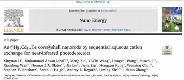 团队在Au@HgxCd1-xTe金属/碲化物半导体核壳纳米棒的精准合成基础上,基于壳层材料的窄带隙特点以及Au纳米棒的表面等离子体共振效应,实现连续可调的可见光-近红外吸收特性。与国家纳米中心谢黎明研究员团队(光电探测器件表征)、英国曼彻斯特大学Sarah J. Haigh教授(高分辨STEM表征)、香港城市大学Andrey L. Rogach教授(海外名师计划资助)合作,利用石墨烯高载流子迁移率的特点,实现了石墨烯/Au@HgxCd1-xTe纳米棒光电器件的合成。所合成的器件实现了可见光到近红外宽波段(550-1300 nm)的高光响应效率(~106 A/W)。展示了其在红外光电探测领域方面的应用价值。相关工作以“Au@HgxCd1-xTe core@shell nanorods by sequential aqueous cation exchange for near-infrared photodetectors”为题发表在《Nano Energy》 杂志上(2019, 57, 57-65)。李欣远博士研究生为论文第一作者。