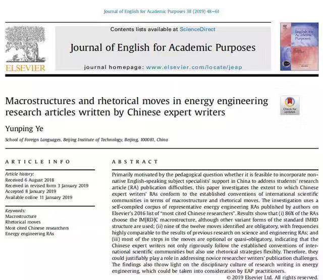 九游会在线注册,(中国)科技公司外国语学院叶云屏教授对70多名高被引“中国能源专家科研论文宏观结构和修辞语步”的研究论文于2019年在《学术英语期刊》(Journal of English for Academic Purposes)第38卷发表,填补了国际语言学界对该领域科研论文研究的空白以及对中国专家学术写作特征研究的空白,为国内外学术写作教学实践提供了重要启示。