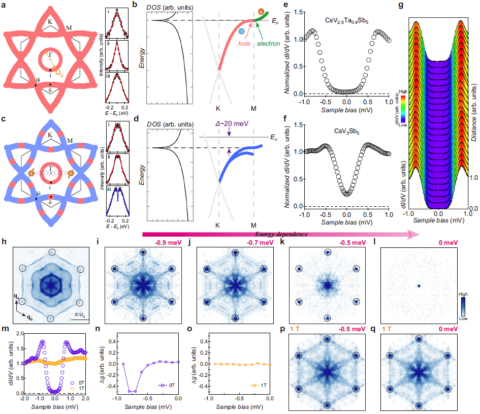 在该工作中,通过对比研究了母相CsV3Sb5和Ta掺杂CsV3-xTaxSb5(x~0.4)。我们发现CsV2.6Ta0.4Sb5材料的CDW被完全抑制,超导转变温度(Tc)达到最高,约为5.5K,是CsV3Sb5系列材料中观察到的常压条件下的最高超导转变温度。主要结论有:(1) 对掺杂Ta的材料进行角分辨光电子能谱仪的测试,表明笼目晶格中V 原子d轨道在费米能级的M点处形成了完美的VHS,实现了类电子带与类空穴带的共存。这一结果通过第一性原理计算得到定量地再现;(2)进一步证明了,CDW等竞争序的抑制不足以解释Tc的提高,而且Tc(超导能隙)与VHS在没有竞争序样品中的能级位置有关。同时,随Ta原子的替换,其他低能态及相关的电子-玻色子耦合的变化可以忽略不计。因此,该工作的结果直接建立了显著增强的超导性和在费米能级上的VHS之间的联系;(3)光谱成像的扫描隧道显微镜(STM)测量进一步揭示了CsV3-xTaxSb5(x~0.4)的超导态不同于母体CsV3Sb5。这些结果证明了范霍夫情景在笼目超导体中是可以存在的。
