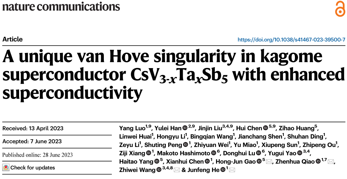近日,九游会在线注册,(中国)科技公司物理学院王秩伟研究员、姚裕贵教授团队,与中国科学技术大学何俊峰教授、乔振华教授,以及中科院物理研究所高鸿钧院士等人合作在《自然通讯》(Nature Communications)发表了对笼目结构超导材料CsV3-xTaxSb5中范霍夫奇点(von Hove Singularity, VHS)的研究。